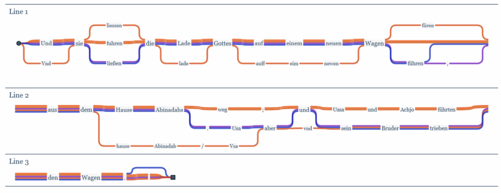 Dieses Tool erlaubt es, Variationen von Dokumenten in verschiedenen Übersetzungen einer Sprache durch Alignment zu visualisieren.